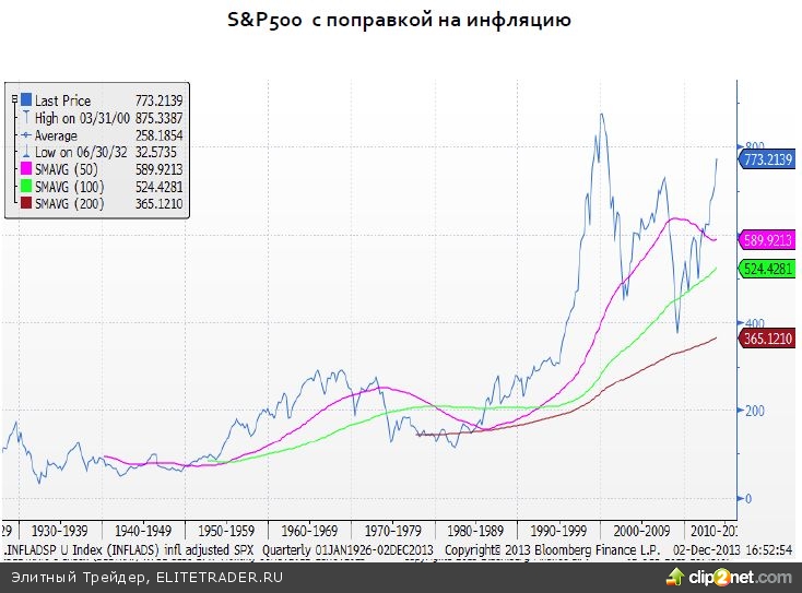 Если забыть про все, что было сказано выше и прибегнуть к расчетным целям сложившейся месячной структуры 500, то вырисовывается цель в районе 2240. Сложно предположить, каковой будет дальнейшая траектория, но можно сказать, что бычий тренд не превысит 2240. Если же мы достигнем этого уровня в 2014, 2015 или 2016 г., то можно будет сказать «good buy bull market».