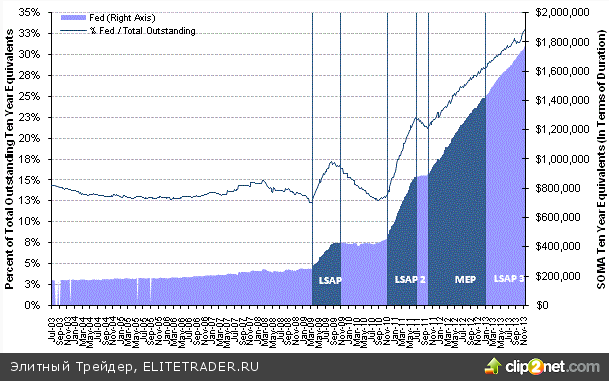 В случае с QE2 снизить доходность помог twist, сейчас же его функции вполне способны взять на себя операции РЕПО. Они наверняка проявят себя с лучшей стороны, особенно учитывая, что ФРС, по сути, является своеобразным монополистом долгового рынка США, так как в его распоряжении находится около трети всех эмитированных обязательств.