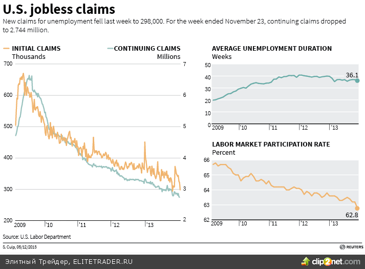 Если здесь есть с чем спорить, то данные Министерства труда по заявкам на получение пособий по безработице менее противоречивы, и вчера они указали на снижение до 298 тыс., аналитики ожидали увеличения до 325 тыс. Ниже 300 тыс., показатель опускался единожды в сентябре, тогда как ранее подобные уровни наблюдались в 2007 году.