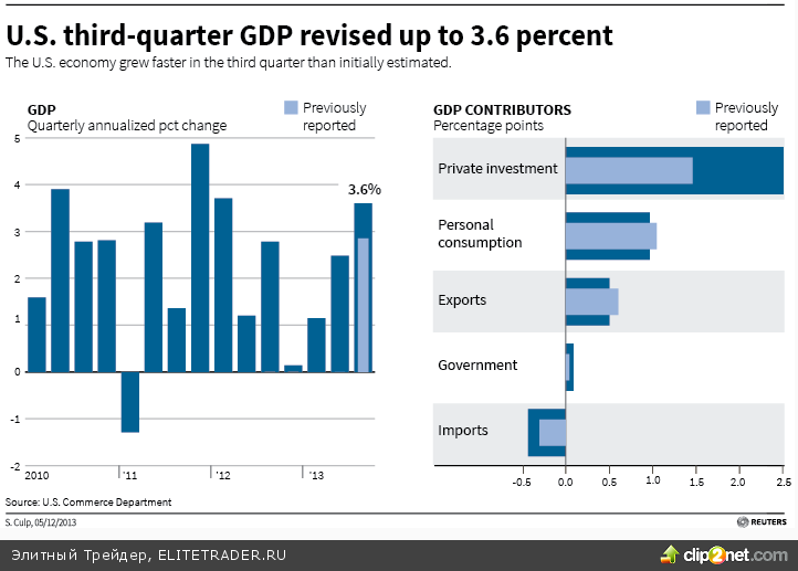 Что касается статистики, вчера еще в большей степени, чем месяцем ранее при первой оценке, удивили рынок цифры по динамике ВВП за третий квартал. Как оказалось, аннуализированный показатель вырос на 3,6%, то есть если рост который был в третьем квартале проецировать на год, как раз была бы получена данная цифра. Ранее ведомство оценивало рост на 2,8%.