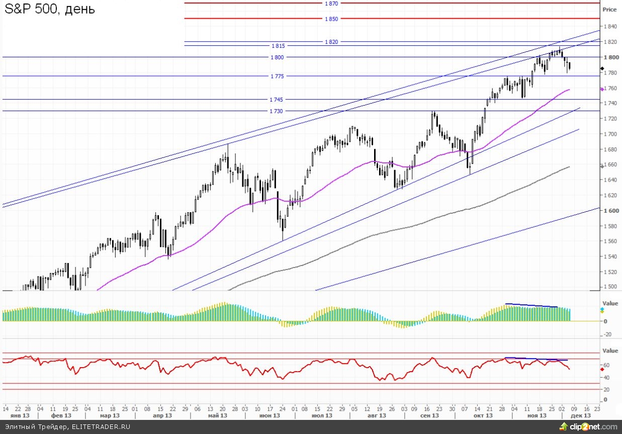 Если выйдут позитивные данные по нонфармам (выше 200 тыс.), то они наверняка будут негативно восприняты рынком, и S&P 500 продолжит свой откат от недавних максимумов на фоне роста опасений по поводу начала tapering уже на ближайшем заседании 18 декабря. Вероятность этого сценария большинством аналитиков рассматривается как достаточно низкая, однако я считаю, что рынок явно недооценивает шансы снижение объемов QE.