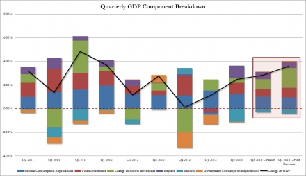 Chessplayer обращает внимание на статистику по ВВП США. Данные, вышедшие с задержкой в 9 дней из-за приостановки правительства, на первый взгляд впечатляют: 3,6%, и лучше ожиданий на 0,5%. Это повышает вероятность сокращения QE в декабре.