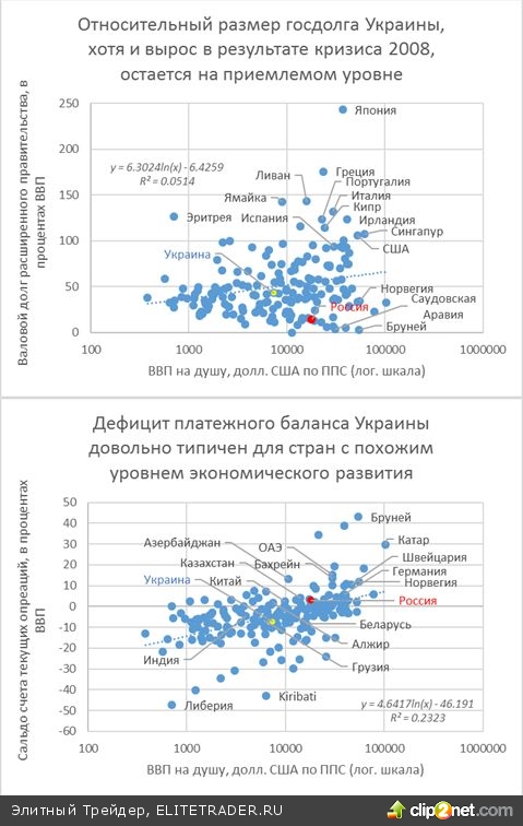 Однако для страны со средними доходами, каковой по мировым меркам является Украина (7.3 тыс. долл. на душу по ППС в 2013 по версии Мирового банка, а средним по тем же данным считался 7.194) дефицит текущего счета, покрываемый притоком капитала – типичен. Отток капитала – привилегия сравнительно богатых стран, особенно нефтеэкспортеров, в число которых попала и Россия (душевой доход в прошлом году тут по ППС в 3.11 раза превышал средний валовой доход украинца).