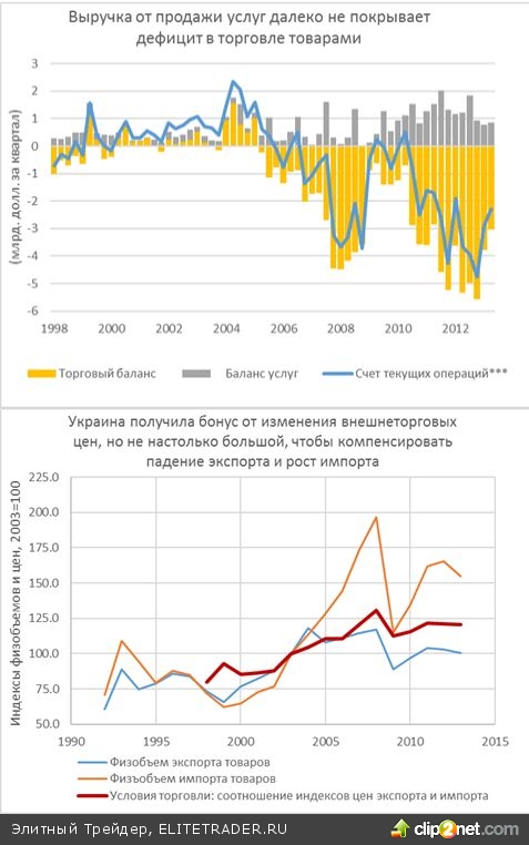 4. Популярна версия, что дефицит платежного баланса обязан своим происхождением дорогому российскому газу, и в частности, «кабальным соглашениям», подписанным Тимошенко. Это не так. Несмотря на снижение сырьевых цен (и в т.ч. экспортных цен Украины) после 2011 года, они остаются на достаточно высоком уровне и условия торговли Украины (соотношения экспортных и импортных цен) не ухудшились. По отношению к 2003 году (это последний год перед «оранжевой» революцией, когда торговля оставалась еще сбалансированной), экспортные цены выросли в 2.5-2.6 раза, а цены импорта – в 2-2.1.