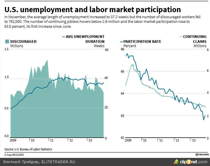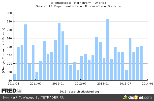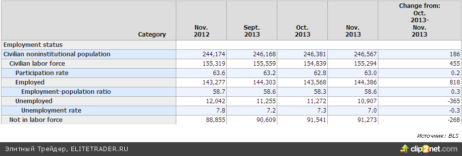 Долгожданный ноябрьский отчет BLS указал на снижение безработицы с 7,3% до 7% -минимального уровня за последние пять лет. Аналитики ожидали снижения только до 7,2%. Если ранее подобный позитив зачастую можно было уличить в определенных тонкостях подсчета с переводом безработных в категорию Not in labor force, то на этот раз все было казалось бы более правдоподобно. Почему «казалось бы», потому что проводимый опрос домохозяйств в ноябре учел тех вышедших в вынужденные отпуска, кого в октябре в связи с shutdown признали безработными.