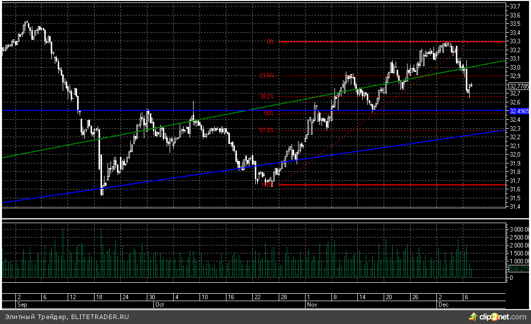 Рубль теряет к доллару 7 копеек. Российская валюта, как и ожидалось, добралась до значимого сопротивления на уровне 32,7. Здесь находится 38,2% коррекции по Фибоначчи к волне роста пары. Поэтому пробить данный уровень без дополнительных драйверов будет сложно, особенно учитывая чрезмерно позитивную реакцию рубля на хорошую американскую статистику, вышедшую на прошлой неделе. Похоже, что участники совсем забыли про возможное сокращение стимулирования в США, но воспоминания могут появиться в любую минуту, и доллар вновь будет укрепляться. Первой целью в этом случае станет уровень 32,9. Тем временем в текущий момент поддержку рублю оказывают высокие цены на нефть, которые по сорту Brent торгуются выше 111 долларов за баррель, а также ежедневные интервенции ЦБ в размере 200 млн долларов.