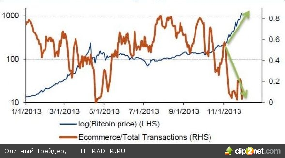 По оценкам BoA Merrill Lynch, основанным на спросе пользователей из США и других стран мира на виртуальные деньги в качестве средств расчета, справедливая стоимость BitCoin оставляет $1300. При этом резкий взлет котировок вызывает сокращение транзакций.