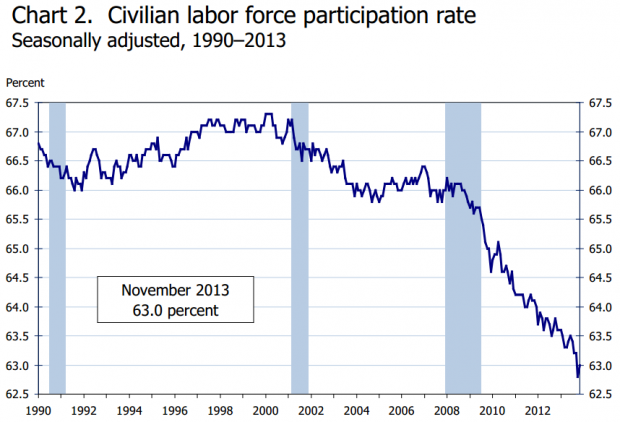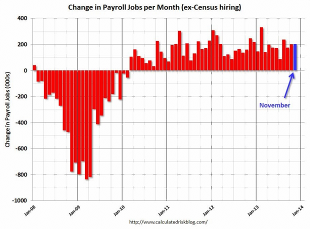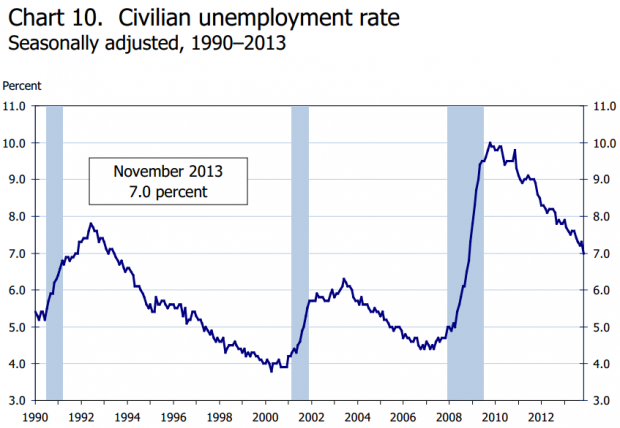 Отчет по занятости показал, что американская экономика создала 203К рабочих мест в ноябре, уровень безработицы упал до 7.0%. Далее следует график Бюро статистики труда, показывающий, что уровень безработицы с сезонными корректировками возвращается к уровню 1990 года (рецессии затемнены).