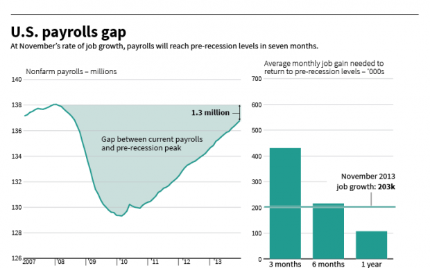 Reuters также показала график провала в занятости – количество рабочих мест, которые необходимо создать экономике, чтобы вернуться к дорецессионному максимуму. В рамках текущего уровня роста занятости, понадобится ещё семь месяцев, чтобы восполнить пробел.