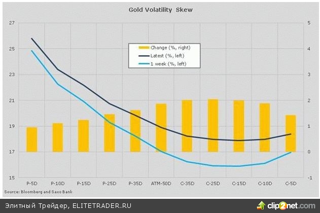 Возобновившееся на прошлой неделе снижение золота привело к росту подразумеваемой волатильности, чему способствовало все большее количество спекуляций о том, что текущий торговый диапазон могут проверить на прочность. Таким образом, нет ничего удивительного в том, что значительный перевес оказался на стороне защиты от убытков. Десять наиболее активно торгуемых опционных страйков равномерно распределялись между опционами на продажу и на покупку.