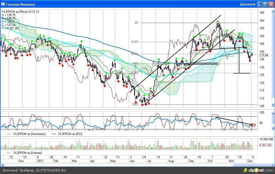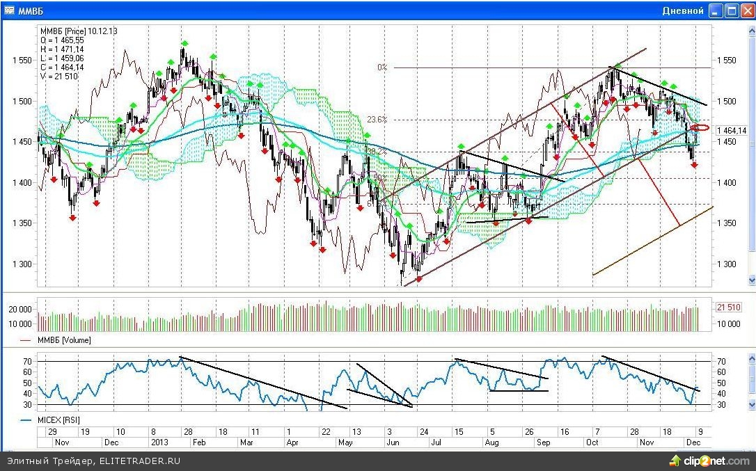 При таком негативном развитии событий, наблюдавшийся двухдневный рост рынка не что иное, как отскок до пройденных ранее уровней поддержки. Если анализировать именно дневной график индекса ММВБ, то это тест снизу пробитого 3-го декабря уровня поддержки долгосрочного восходящего тренда, в котором индекс находился с середины июня этого года.