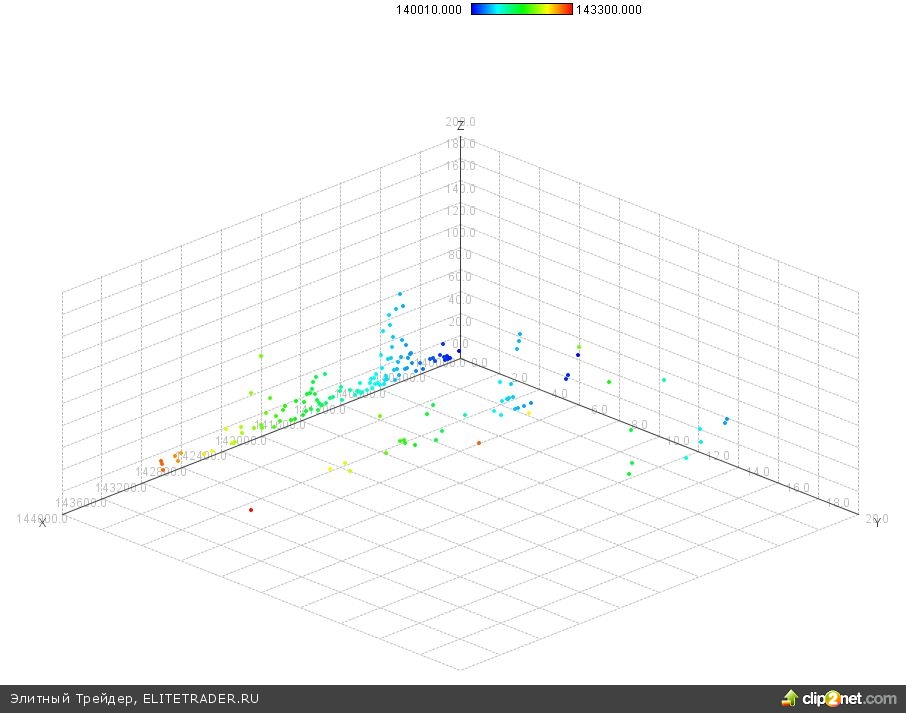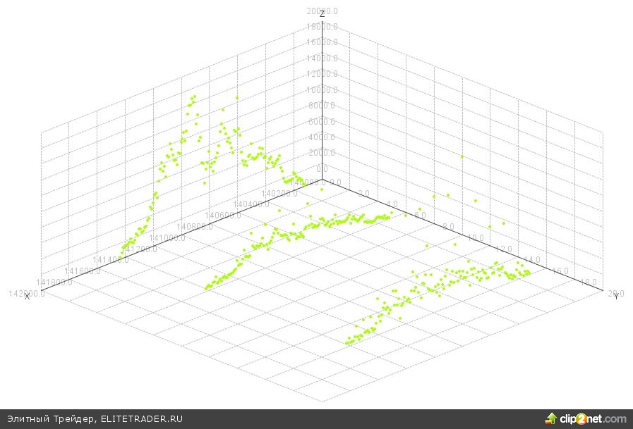 по оси X — цена, по оси Z — объем, по оси Y — группа (0-5; 6-15; >16 контрактов). Основная активность на этом шипе была в районе 140 400 — 141 200 пунктов.