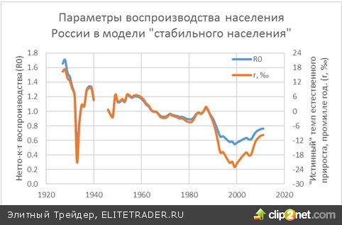 показывающий, следует ли рассчитывать на его расширение или сжатие при приближении к стабильному режиму воспроизводства, достаточно просто выражается через СКР и средний возраст матери при рождении (точнее, вероятность дожить до него). Этого не скажешь про темп такого расширения или сжатия стабильного населения («истинный» естественный прирост, intrinsic rate of natural increase). Он с помощью довольно сложной формулы может быть посчитан через моменты паттерна распределения рождений по возрастам матерей (с учетом вероятности дожития до этих возрастов, которая сегодня, правда, практически мало отличается от 1), см. эту формулу, напр., в [3], раздел Technical Notes.
