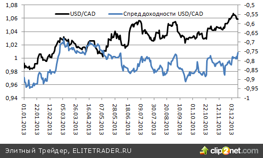 Вместе с тем перспективы канадского доллара не столь оптимистичны, как это может показаться на первый взгляд. Релизы сильных индикаторов, характеризующих состояние экономики США, а также урегулирование проблемы с бюджетным дефицитом позволяет рассчитывать на скорое сворачивание американского QE, что чревато оттоком капитала с суверенного фондового рынка Страны кленового листа. Рост доходности американских бондов сделает их более привлекательными по сравнению с канадскими, в результате чего увеличится дифференциал, динамика которого тесно коррелирует с котировками USD/CAD.