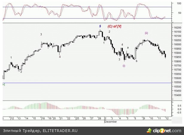 Завершилось формирование волны 5 of (C) of [Y], которая состоит из импульса наверх. В ней закончилась 5-ая внутренняя волна. Сформированы потенциальные разворотные волны 1-2, началась волна 3. Локальное подтверждение завершения фигуры - 15867-15587 пунктов. Основной уровень перелома движения - 15136 и 15369 пунктов.