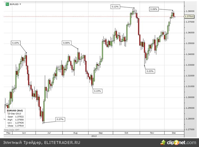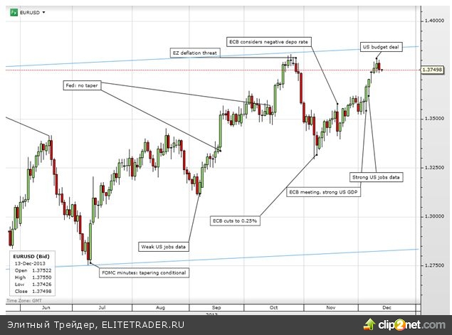 Год подходит к концу, но перед этим Федеральный комитет по операциям на открытом рынке проведет еще одно заседание на следующей неделе, в связи с чем рынки позиционируются в ожидании возможного объявления о сворачивании программы стимулирующих мер. США продолжают радовать благоприятной статистикой, и неопределенность вокруг переговоров о бюджете уменьшается. Все это может подтолкнуть ФРС к тому, чтобы объявить о начале сокращения покупок активов. Поэтому неудивительно, что американский фондовый рынок в последние дни сдавал позиции, а пара евро/доллар вчера уступила часть своих достижений.