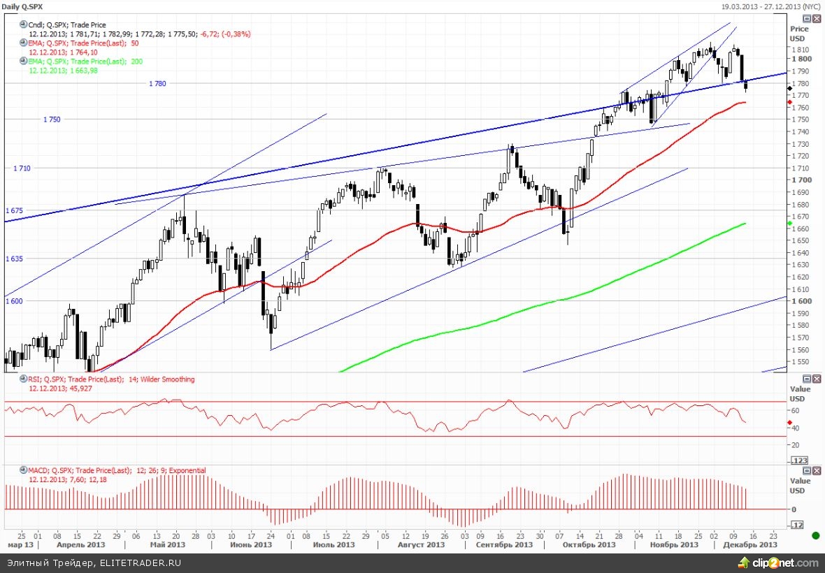 В пятницу, 13 декабря, фьючерсы на американские индексы умеренно растут: DJIA (+0.24%), S&P 500 (+0.36%), Nasdaq (+0.45%) (17:15 мск). Технический отскок перед выходными, тем не менее, не меняет общую негативную картину всей недели. Сильная статистика и бюджетное соглашение стали очередными поводами спекулировать на тему QE Exit в преддверии последнего в этом году заседания ФРС.