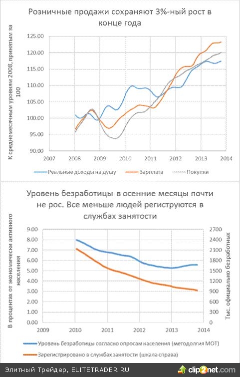 3. Можно еще отметить, что стагнация выпуска практически никак не отразилась на благосостоянии населения. Скорость роста покупок в розничной торговле за 2 года снизилась лишь на 1 пункт, с 4 до 3% год. И то, вероятно, за счет того, что многие товары становятся функциональнее и дешевле, и эти «гедонистические сдвиги» не фиксируются нашей статистикой. Уровень безработицы, слегка поднявшийся в первой половине года, в дальнейшем перестал расти.