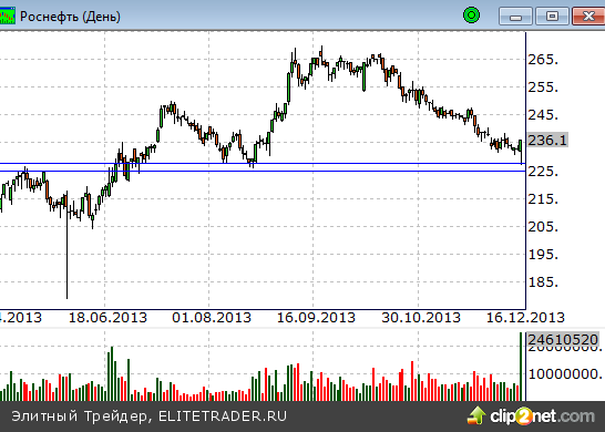 Цена достигла горизонтального уровня поддержки. расположенного на отметках 227-225 рублей. Итогом вчерашнего дня стал уверенный отбой от нее вверх на высоком объеме торгов. Таким образом, сложились предпосылки для движения цен на север. Возможные откаты будут использоваться для покупок.