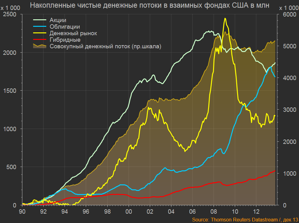 ETF фонды. По ряду свидетельств там приток средств. Есть только в американские акции, то пришло примерно 300 млрд с 2008 и всего 60-70 млрд в этом году. В совокупности не компенсирует отток из взаимных фондов.