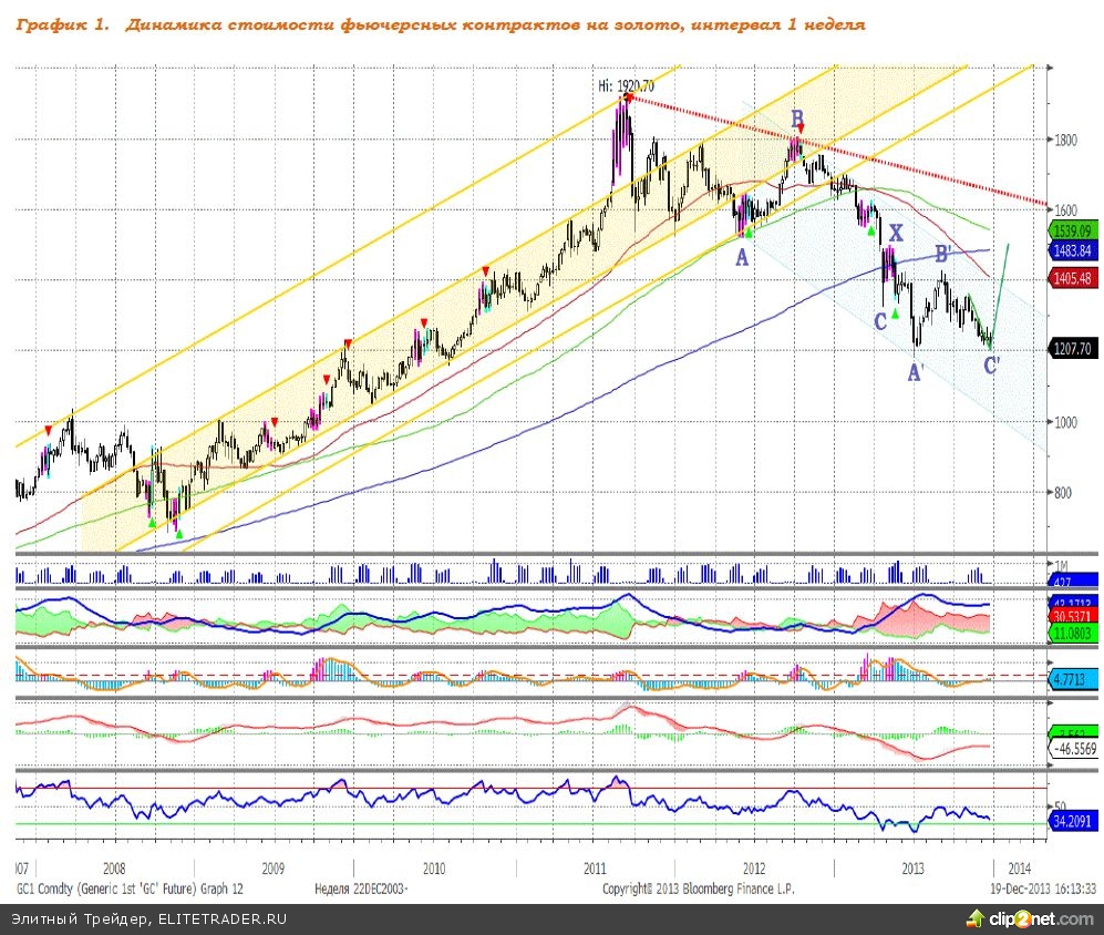 Котировки золота приблизились к диапазону значений $1175-1200 за тройскую унцию, тем самым завершая волновую структуру снижения. В ближайшей перспективе котировки драгоценного металла могут возобновить рост, что стало причиной закрытия короткой позиции по золоту в нашем модельном портфеле. На графике 2 мы отобразили зеленой пунктирной линией предполагаемую динамику стоимости контракта на золото. Полагаем, в скором времени, после достижения минимального уровня ($1175-1180), которое было показано в конце июня 2013 года, цены на золото пойдут вверх, сформировав масштабную модель «двойное дно» (см. график 1), что станет сигналом к долгосрочному восходящему тренду.