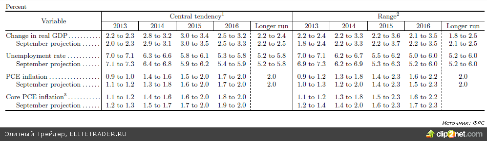 В обнародованных коллективных прогнозах членов ФРС отмечается повышение ориентиров по ВВП на 2013 год. Изменения в прогнозах уровня безработицы и инфляции на 2014 года скорее носили уточняющий характер - диапазон оценки инфляции сужен с 1,3%-1,8% до 1,4%-1,6%.