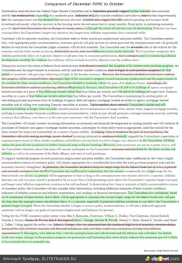 «Если поступающая информация в целом поддержит ожидания Комитета относительно постоянного улучшения условий на рынке труда и инфляция вернется к долгосрочной цели, Комитет, вероятно, будет снижать темпы покупок активов в дальнейшем размеренными шагами». Но по-прежнему FOMC ссылается на то, что темпы покупок заранее не определены.