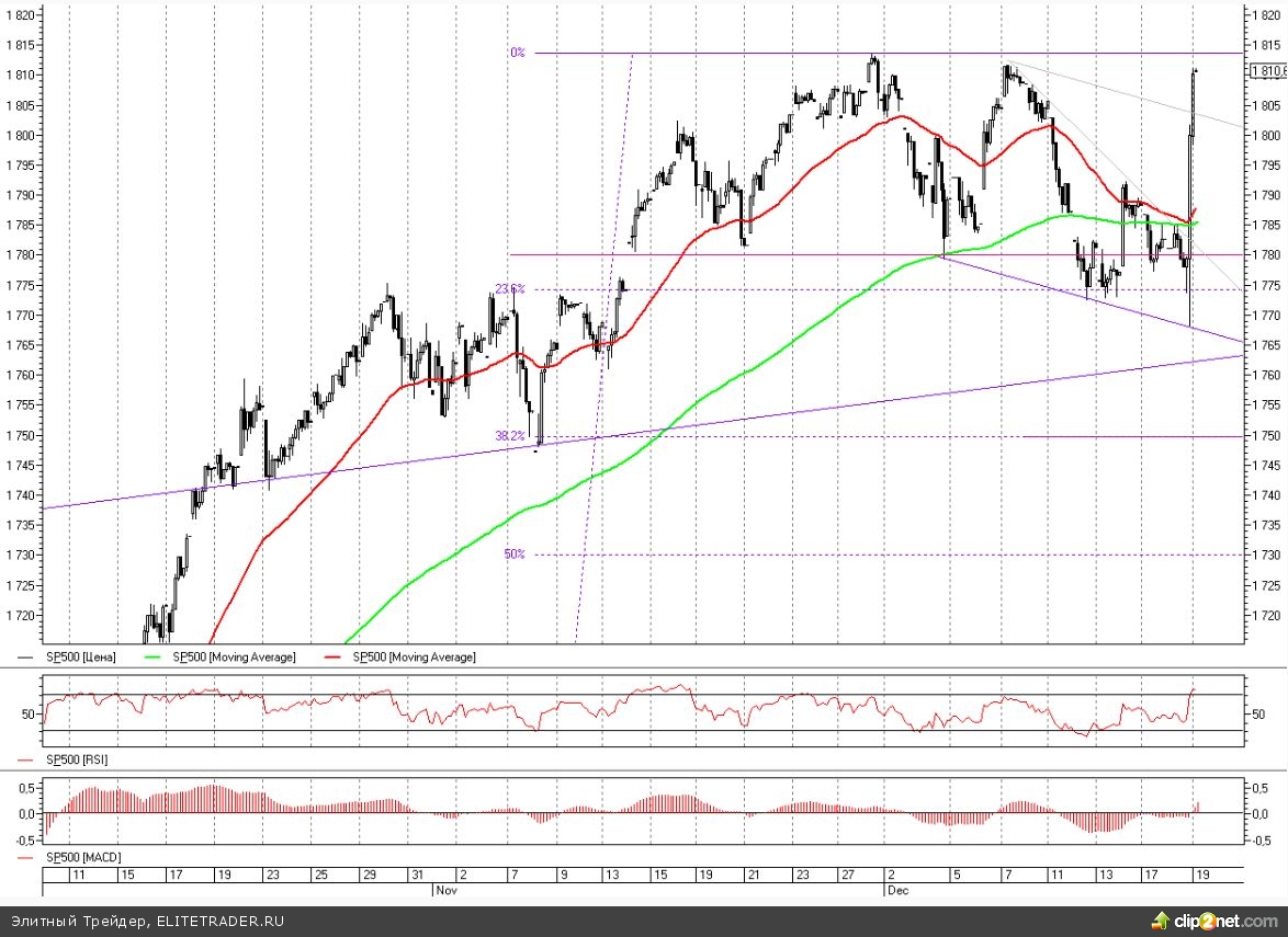 Потрясло вчера американский рынок на фоне публикации итогов последнего в текущем году заседания ФРС. Индекс S&P500 успел обновить месячные минимумы, после чего резко выстрелил вверх, вернувшись к историческим максимумам. С учетом того, что Фед принял, очевидно, негативное решения для рынка акций в среднесрочной перспективе снизив темпы стимулирования вчерашняя реакция выглядит сугубо спекулятивной, но какое-то время она еще может продолжаться, и скорее всего медведи вернутся уже после обновления рекордных максимумов.