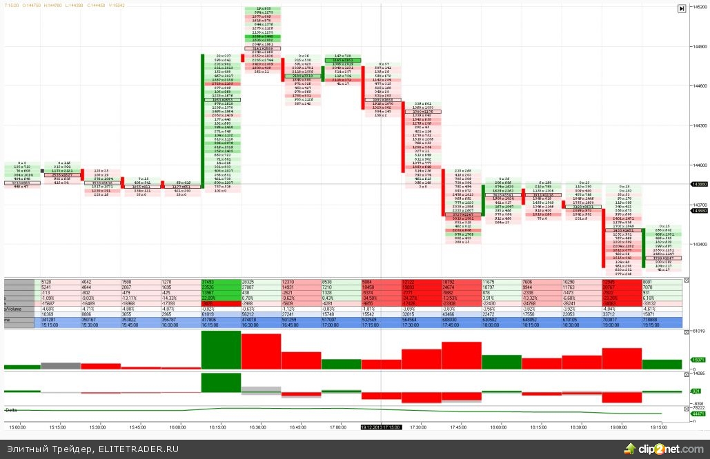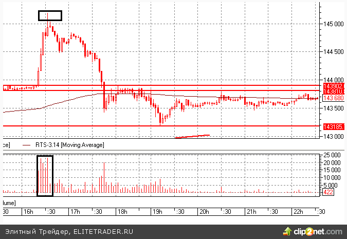 Фьючерс на индекс РТС после вчерашнего бурного застолья на итогах ФРС сегодня утром жестко встречали в районе 145 000 пунктов. Встречали лимитками. Потом с рынка исчезли активные игроки, началось ленивое сползание. Но вечерний импульс-тест 145 000 пунктов показал, что хищная рыба спала весь день и потом вечером яростно начала истреблять мальков. Накушавшись в удовольствие цену вернули туда же, откуда начался этот импульс, в районе 143 500 — 143 700 пунктов.