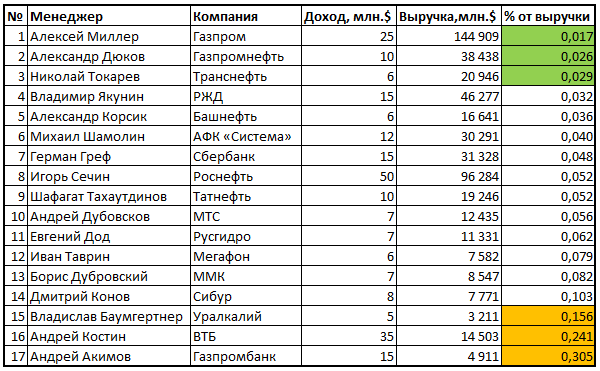 Петр I В сети не так давно появился рейтинг доходов топ-менеджеров компаний. Однако он не дает представления - кто же из них самый скромный, а где наоборот акционеры излишне щедро оценивают деятельность топ-менеджера. Для этого я вычислил долю выручки за 2012 год, которая приходится на доходы топ-менеджера, отсортировав по возрастанию мы получим рейтинг скромности топ-менеджеров.