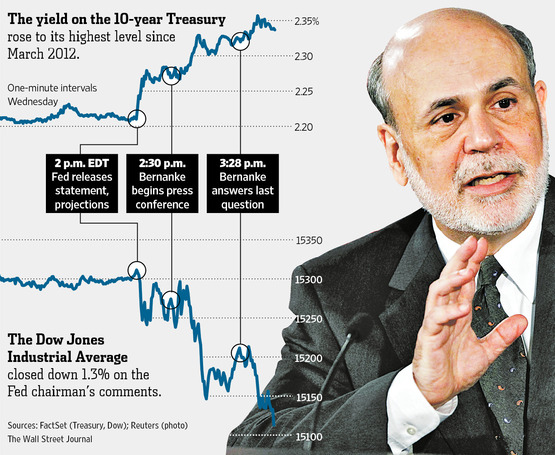 3. ФРС приписал достигнутое в последнее время уверенное и самоподдерживающееся улучшение на рынке труда себе, хотя нет никакой возможности сравнить с тем, что было бы без QE. В то же время значительное число членов ФКОР полагают, что в этой политике они, возможно, зашли слишком далеко и выход из нее не будет таким уж безболезненным. Первым признаком возможной «жесткой посадки» стала реакция на предположение Бернанке 22 мая, что сжатие QE может произойти еще до конца 2013. Этот намек сразу же увеличил времннУю премию по 10-летним казначейским облигациям на 120 б.п., ликвидировав весь эффект в этом отношении, достигнутый в ходе QE3, уронил фондовые индексы, и вызвал девальвации валют развивающихся стран из-за сокращения дифференциалов ставок. (Реакция рынков на это выступление главы ФРС - на картинке в правом верхнем углу).