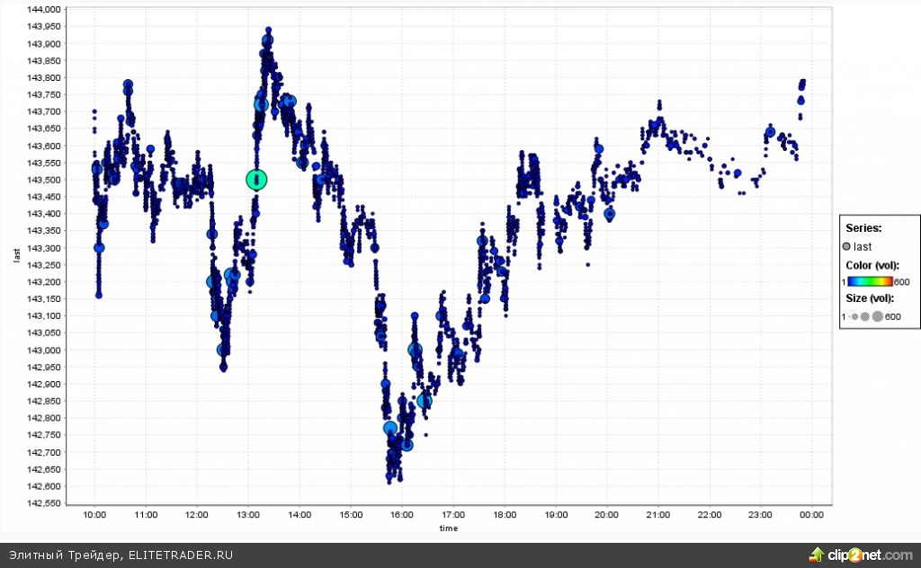 Самая высокая активность по критерию «Объемы» во фьючерсе RIH4 сегодня наблюдалась на локальном внутридневном максимуме 143 700-143 900 пунктов в районе 13-14 часов. Второй локальный всплеск объемов пришелся в 16 часов в районе 142 650-142 950 пунктов. Максимальные объемы дня были на 143 500 пунктах.