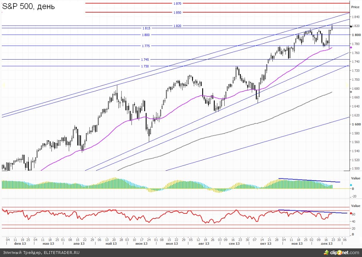 Напомню, что текущая неделя будет праздничной. В связи с католическим рождеством торги во вторник будут укороченными, а в среду за океаном полноценный выходной день. Активность торгов может снижаться, но не исключаю, что последний день 2013 года символично придется на новый исторический максимум. При таком раскладе получится ситуация, когда минимум года пришелся на первый день торгов, а максимум на последний.