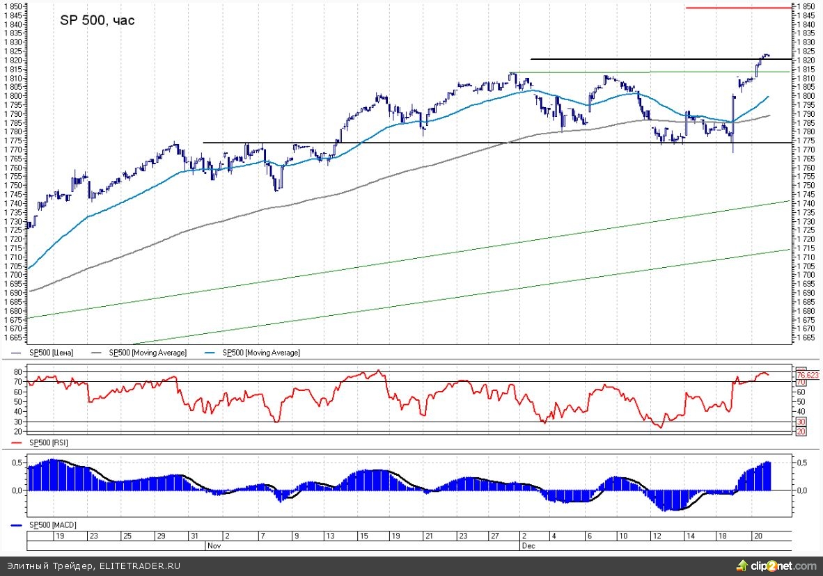 Непосредственно в пятницу индекс широкого рынка S&P500 прибавил почти пол процента, в моменте поднимаясь выше 1820 пунктов. Если это не финальный рывок перед коррекцией, индекс при очередном подъеме выше данной отметки будет целить уже в район 1850. Но едва ли это вопрос оставшихся в уходящем году буквально нескольких сессий, с учетом предстоящего выходного на празднование Рождества.