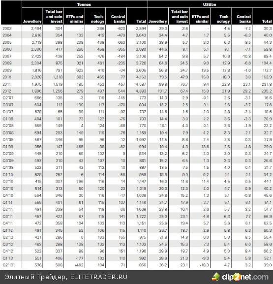 За первую половину 2013 года из «золотых» активов ETF, а также других фондов выведено порядка 579 тонн золота. Чтобы разобраться мало это или много, сопоставим цифры. Начиная с третьего квартала 2010 года и заканчивая концом 2012 года, приток в ETF фонды, обеспеченные золотом, составил 470 тонн. То есть мы видим, что отток золота в 2013 году крайне велик.