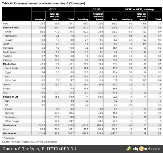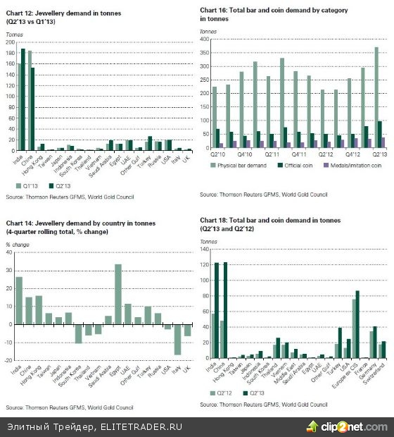 Сейчас биржевые цены на золото продолжают падать. На момент написания статьи 13 часов 19.12.2013г. котировки опустились до $1200/тр. унц. Однако, когда кто-то продает, кто-то покупает! Ниже — данные спроса за 2й квартал 2013 года по отношению ко 2му кварталу 2012 года.