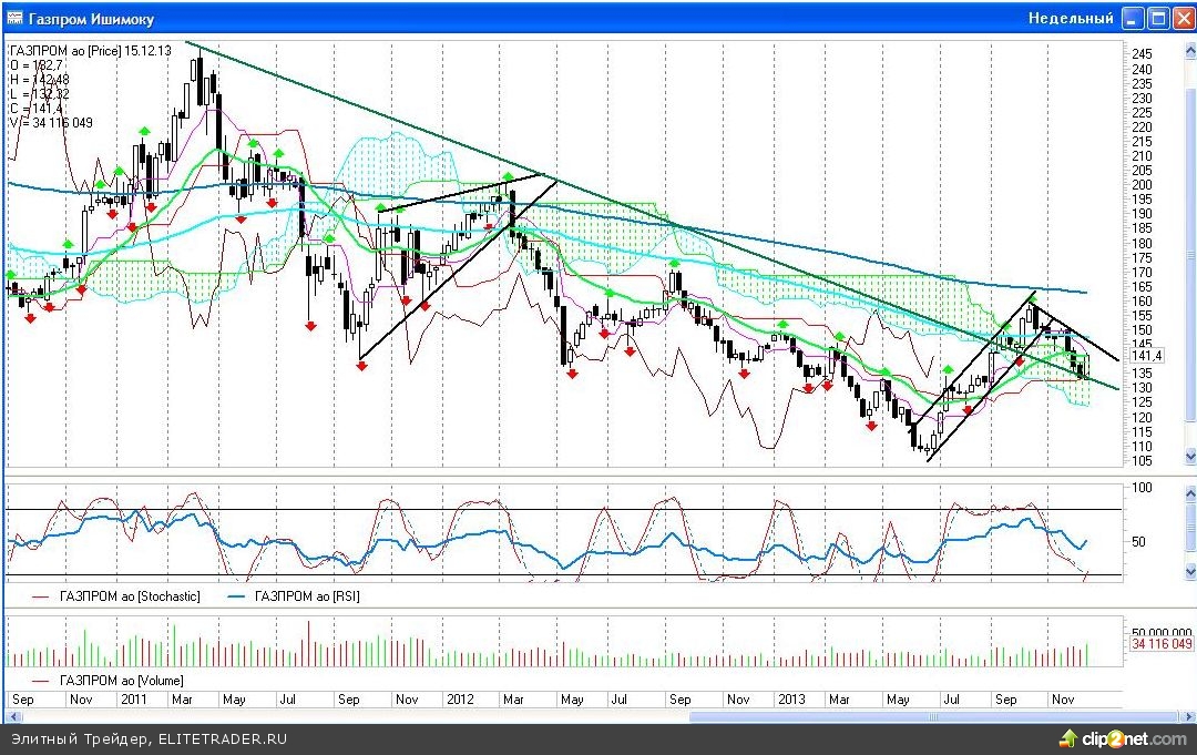 Акции «Газпрома», как и ожидалось, закончили торги прошлой недели очень позитивно, продемонстрировав рост котировок на 5,95%. По итогам прошлой недели на недельном графике бумаг была образована свечная комбинация «бычье» поглощение, которая появилась ровно возле линии сопротивления выбитого в сентябре наверх пятилетнего нисходящего тренда. А это значит, что откат цены к данному уровню можно расценивать как тест бывшего ранее сопротивления на предмет поддержки.