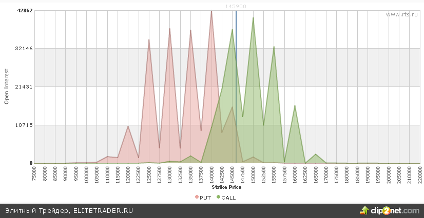 Между тем открытые опционные позиции по RIH4 со сроком исполнения 15.01.14 сейчас также находятся в умеренно негативном положении. Большое количество открытых опционов колл расположилось на уровнях 145000 и 150000, что говорит о сильных сопротивлениях в этом диапазоне. В свою очередь ближайшая сильная поддержка в виде большого количества опционов пут находится лишь на отметке 140000.