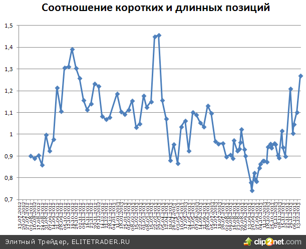 Обратив внимание на открытые юридическими лицами позиции по фьючерсу на индекс, можно заметить, что настроения крупных игроков за прошедшую неделю достаточно существенно сместились в сторону продаж и теперь уверенно смотрят вниз. Соотношение коротких и длинных позиций сейчас составляет 1,269, против 1,10 неделей ранее.