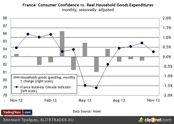 На таком негативном фоне ожидать самого худшего от сегодняшнего отчета о потребительских расходах за ноябрь совсем нетрудно. В последнее время настроения в потребительском секторе стали более пессимистичными, и реальные расходы на товары для дома снижались в каждом из трех месяцев по октябрь включительно. Ситуация вызывает тревогу, однако стоит отметить, что доля расходов на товары длительного пользования (компонент общих расходов, зависящий от динамики цикла) в последние месяцы повышалась. Сегодня мы, возможно, увидим, что общий результат снова понизился, но если потребление товаров длительного пользования останется в зоне положительных значений, то это может означать, что новая рецессия Франции пока не грозит.