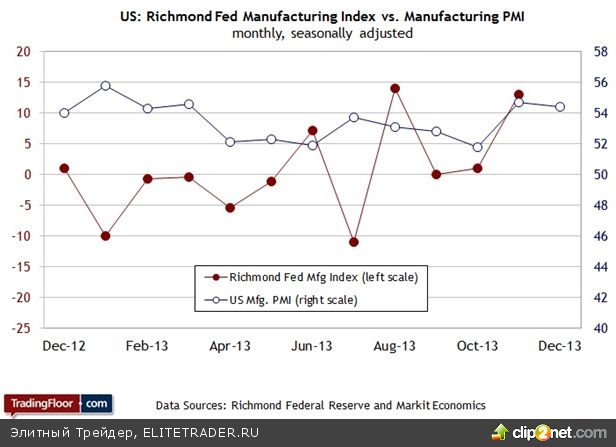 Благодаря сегодняшнему отчету ФРБ Ричмонда мы получим еще одну предварительную оценку экономической активности в декабре. Правда, этот региональный индикатор отражает ограниченный сегмент американской экономики, но в последнее время он более или менее синхронизировался с общей тенденцией в производственном секторе, основанной на сравнении с производственным индексом PMI. Нам уже известно, что, согласно первой оценке от Markit, производственные показатели для США в целом немного ухудшились. Тем не менее, будет интересно узнать, как выстроятся относительно них данные, который предоставит ФРБ Ричмонда.