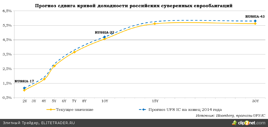 Что касается дальнего участка, то по UST-30 наш прогноз подразумевает рост доходности на 35 б. п., что вкупе с прогнозируемым сужением спреда подразумевает увеличение доходности российского 30-летнего выпуска на 15-20 б. п. Отметим, что на конец 2014 года 2-летним евробондом будет являться выпуск RUSSIA-17, 10-летним – RUSSIA-23, а 30-летним – RUSSIA-43. Соответственно, сдвиг кривой доходности российских еврооблигаций, представленной этими выпусками, будет выглядеть так, как на графике ниже.