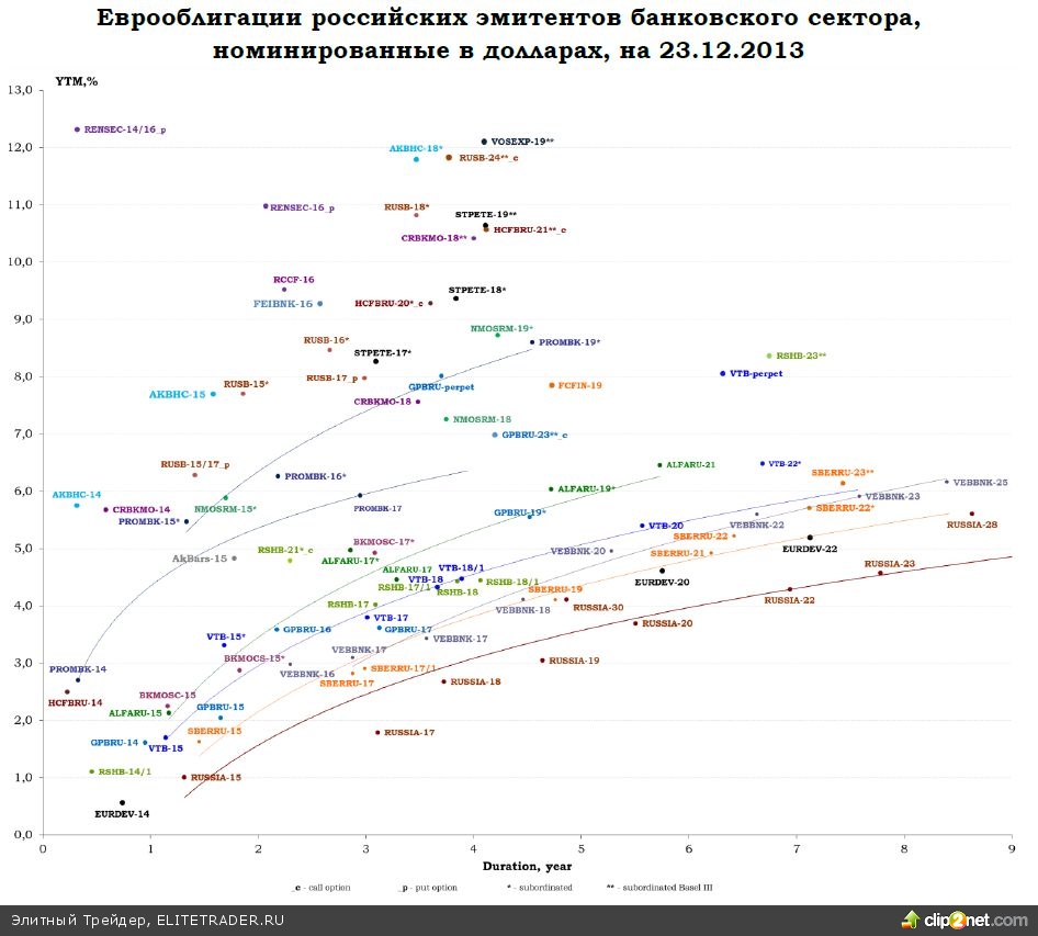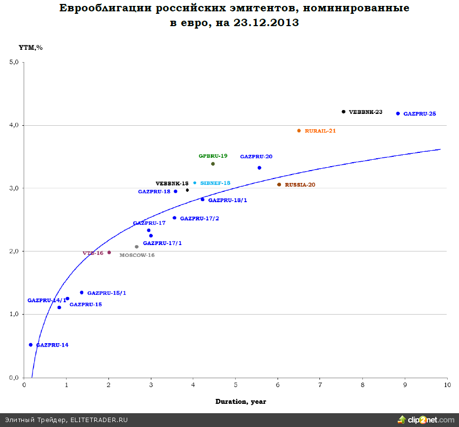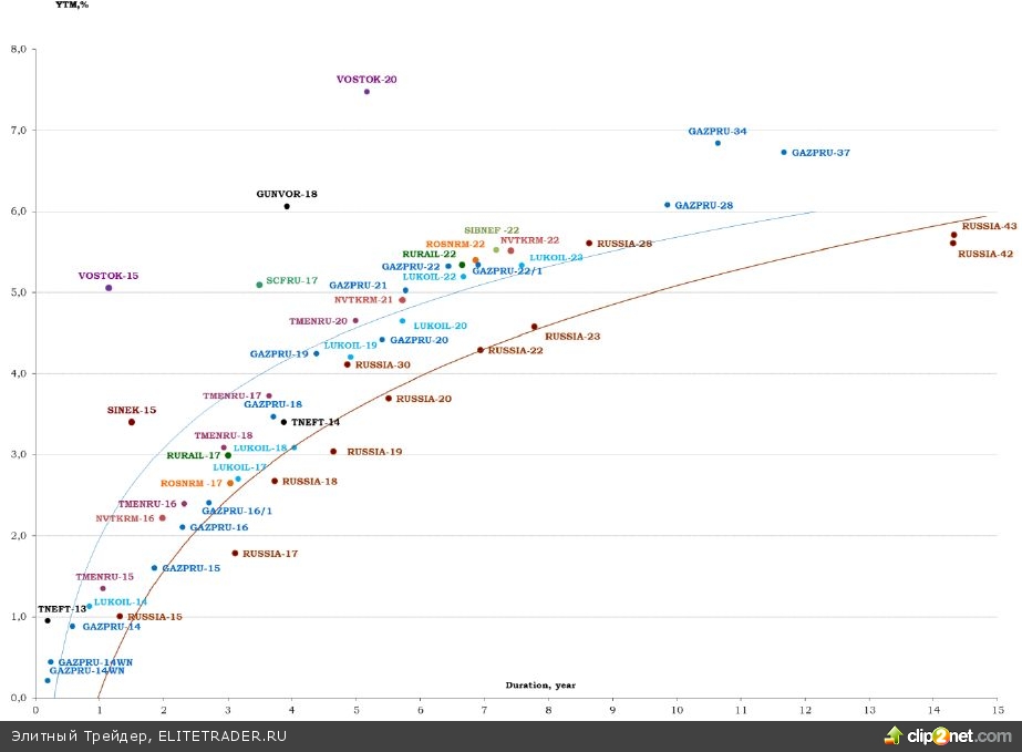 ** Мы используем выпуски RUSSIA-18, RUSSIA-22 и RUSSIA-42 в качестве 5-, 10- и 30-летних выпусков в связи с тем, что евробонды RUSSIA-19, RUSSIA-23 и RUSSIA-43 не имеют достаточно длинной истории обращения.