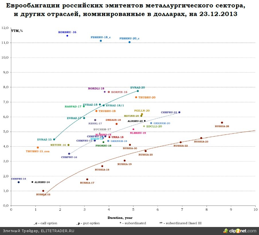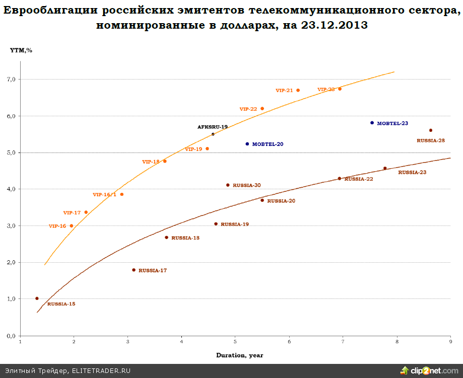 В телекоммуникационном секторе, который смотрится все более привлекательно на фоне замедления промпроизводства в России, для обращающихся выпусков «Вымпелкома» мы видим некоторые понижательные риски в связи с возможностью выпуска эмитентом новых еврооблигаций. Одним из вариантов, дающих возможность поучаствовать в росте интереса к сектору в 2014 году, на наш взгляд, может стать выпуск АФК «Система», чью текущую премию к евробондам дочерней компании МТС мы считаем слишком широкой.