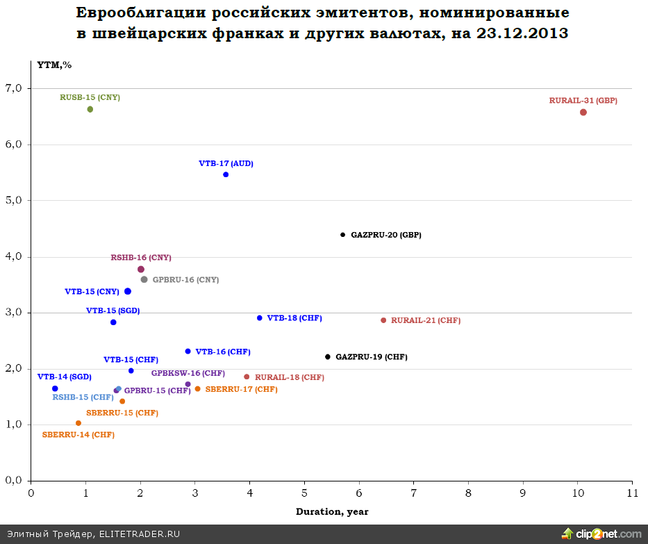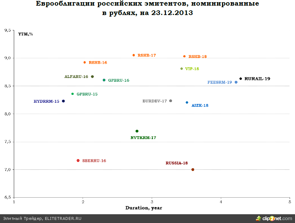 Российские еврооблигации в течение 2013 года демонстрировали схожую динамику с бенчмарком (гособлигациями США) за исключением начала года, когда отечественный рынок выглядел значительно сильнее, и немного позже в начале весны, когда наблюдались активные продажи в связи с опасениями о влиянии финансового кризиса на Кипре на банковский сектор РФ. Тем не менее, в условиях уменьшения влияния внутренних драйверов и на фоне роста влияния внешних факторов после обнародованных весной планов ФРС о сокращении QE3, динамика суверенных евробондов России повторяла динамику US Treasuries, отличаясь лишь амплитудой колебания, что хорошо видно по динамике спреда RUSSIA-30-UST-10.