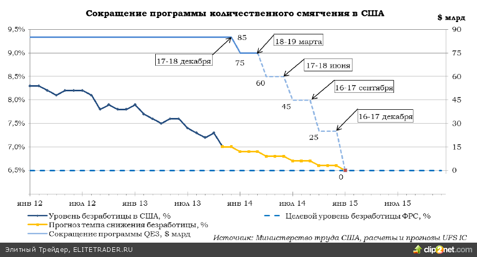 Итак, это случилось. На прошлой неделе по итогам заседания 17-18 декабря американский ЦБ принял решение с 1 января 2014 года сократить объем программы QE3 на $10 млрд до $75 млрд в месяц. Доходность 10-летних американских бумаг прошлась по интервалу 2,82-2,92% в момент объявления решения, после чего вернулась к прежним уровням около 2,88%. Таким образом, долговой рынок отреагировал на решение ФРС спокойно. Дальнейшие действия Федрезерва, на наш взгляд, будут выглядеть следующим образом: на заседании в марте 2014 года количественное смягчение будет уменьшено еще на $15 млрд, после чего аналогичное сокращение произойдет в июне. Оставшиеся $45 млрд ФРС «урежет» в сентябре и декабре путем сокращения стимулирования на $20 млрд и $25 млрд, соответственно.
