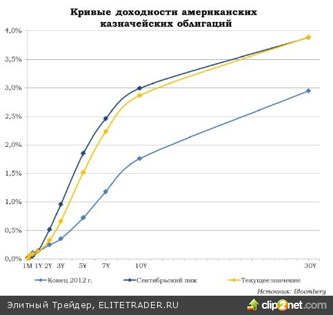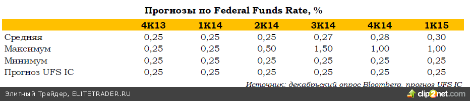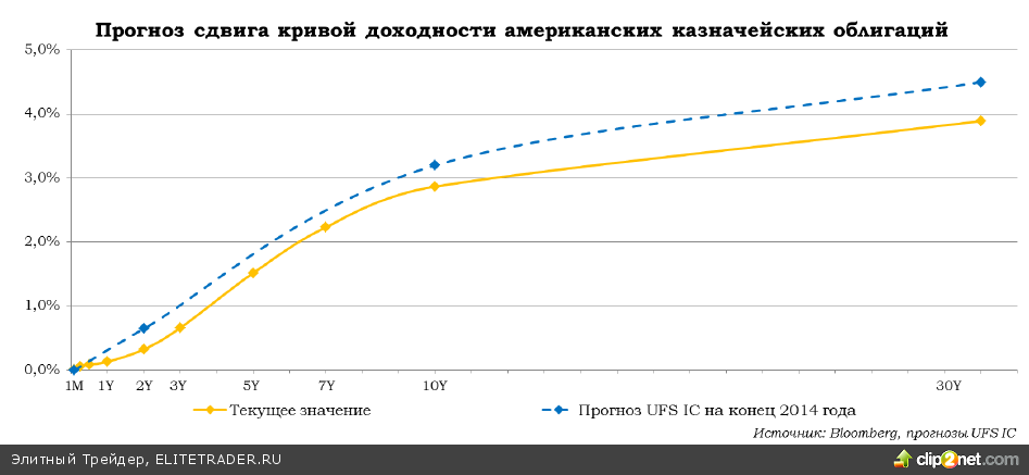 Нашим основным сценарием поведения кривой доходности американских гособлигаций на 2014 год является затухающее продолжение текущих тенденций, а именно более медленный рост ставок на всей кривой при несущественном увеличении ее наклона. Относительно ближнего участка кривой доходности мы ожидаем, что сентябрьский всплеск ставки по UST-2 до отметок 0,53-0,54% останется максимумом не только 2013 года, но также не будет достигнут и в первом полугодии 2014 года. Достижения этих отметок мы ожидаем к концу 3К13, тогда как к концу года доходность 2-летних бумаг окажется на уровне около 0,65% годовых. На текущий момент средние ожидания по рынку предполагают достижение отметки 0,65% уже в 3 квартале 2014 года.