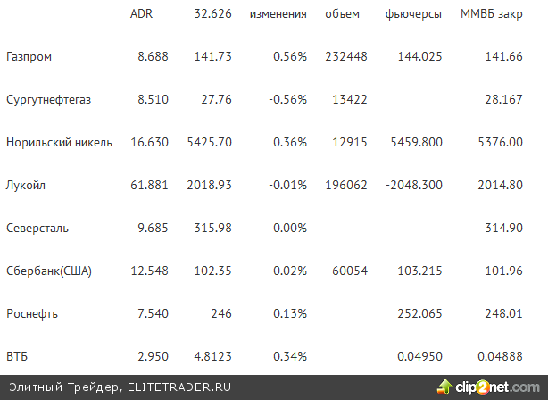 Российские ADR в Нью-Йорке выросли (индекс Блумберга) на 0.18%. Упали Русгидро (-1.7%). Выросли Сургутпреф (+1.79%). Market Vectors Russia ETF вырос 0.35%.