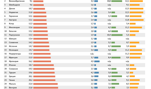 В число лидеров попали также такие страны Северной и Центральной Европы, как Дания, Норвегия, Германия и Австрия. Франция занимает 17-е место, Италия - 19-е.
