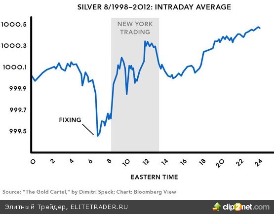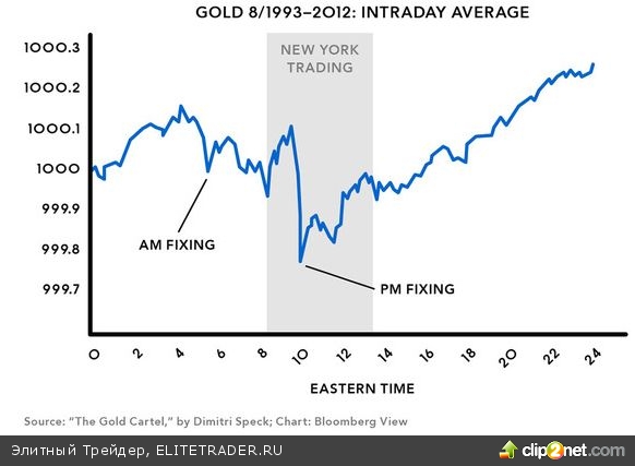 Так ценами манипулируют? Давайте взглянем на данные. В своей книге «Золотой картель» аналитик рынка сырья Димитри Спек складывает поминутные данные с 1993 по 2012 годы, чтобы показать как средняя цена на золото меняется в течение дня. Он выяснил, что спотовая цена на золото имеет тенденцию резко падать ближе к вечернему фиксированию по лондонскому времени. Аналогичное, хотя и менее выраженное падение цены происходит и в районе утреннего фиксирования по лондонскому времени. Такие же дневные спады можно увидеть с 1998 по 2012 годы и в ценах на серебро.